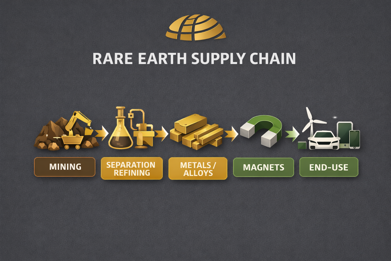 The REE supply chain has multiple stages: mining → concentration → separation/refining → metal/alloy → magnet manufacturing. Traders often focus on mining projects, but the highest leverage point is frequently the separation/refining stage. That’s where capacity is most concentrated and where technical and regulatory barriers are highest.